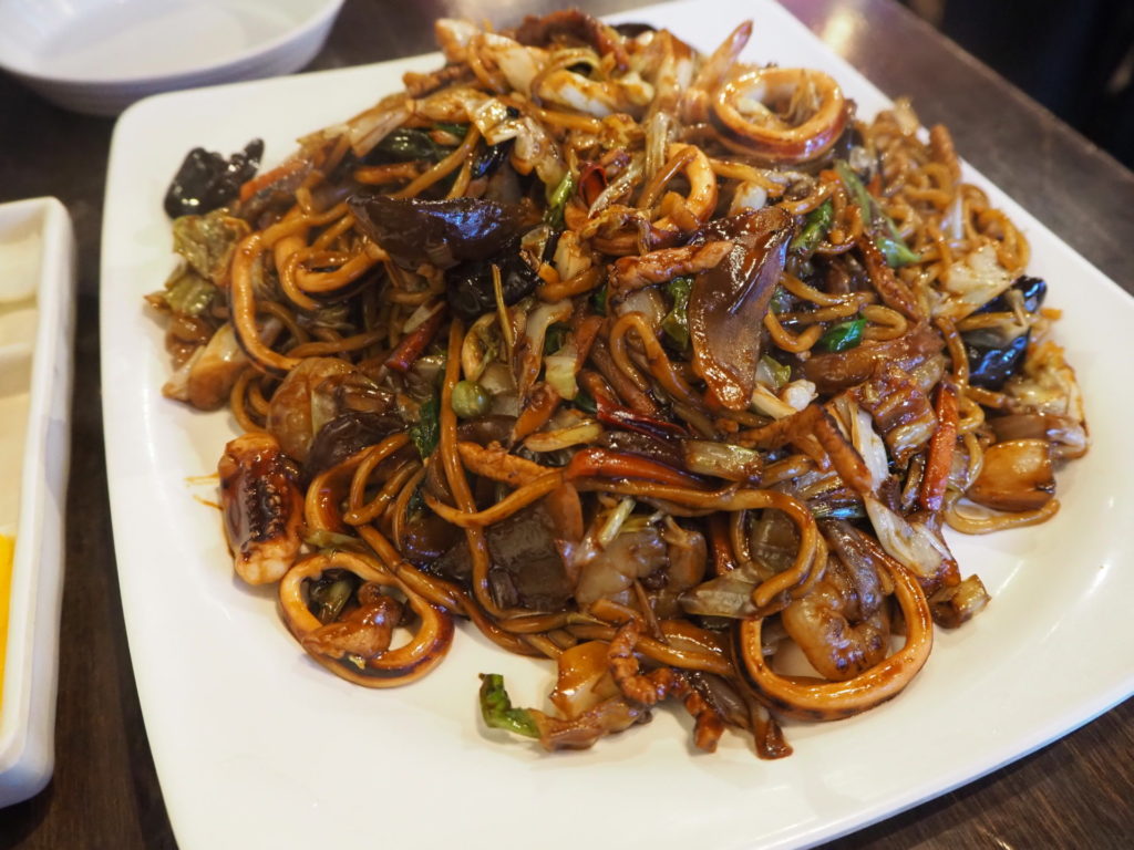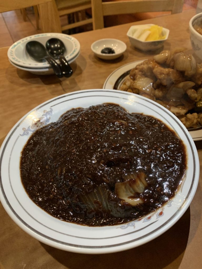 中でも我々夫婦のお気に入りは、中華専門の香港飯店。こちらでは定番の韓国チャンポンとジャージャー麺がいただけます。どちらも美味しいけど、私たちの一押しは「チェンバンチャジャン(쟁반짜장)」(1700円)。