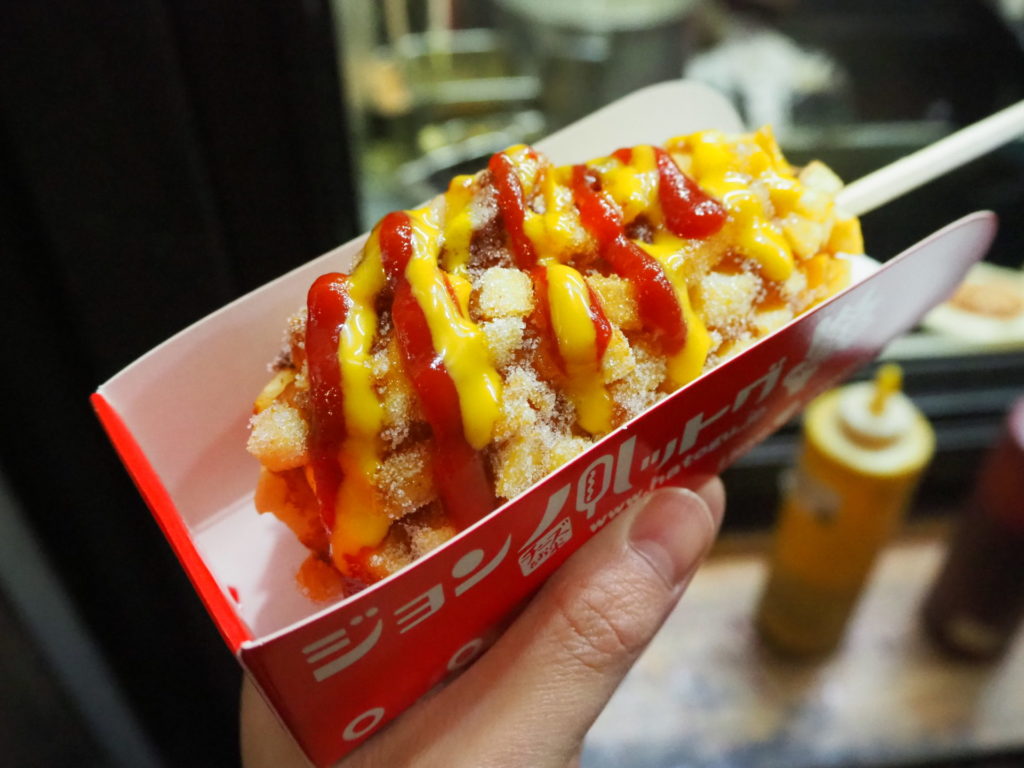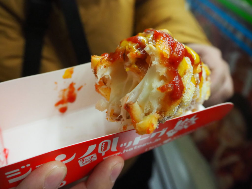 韓国の進化系ホットドッグで、定番のソーセージではなく、モッツァレラチーズが入った衣に、ダイスカットしたじゃがいもを散りばめて、揚げた状態で出てきます。