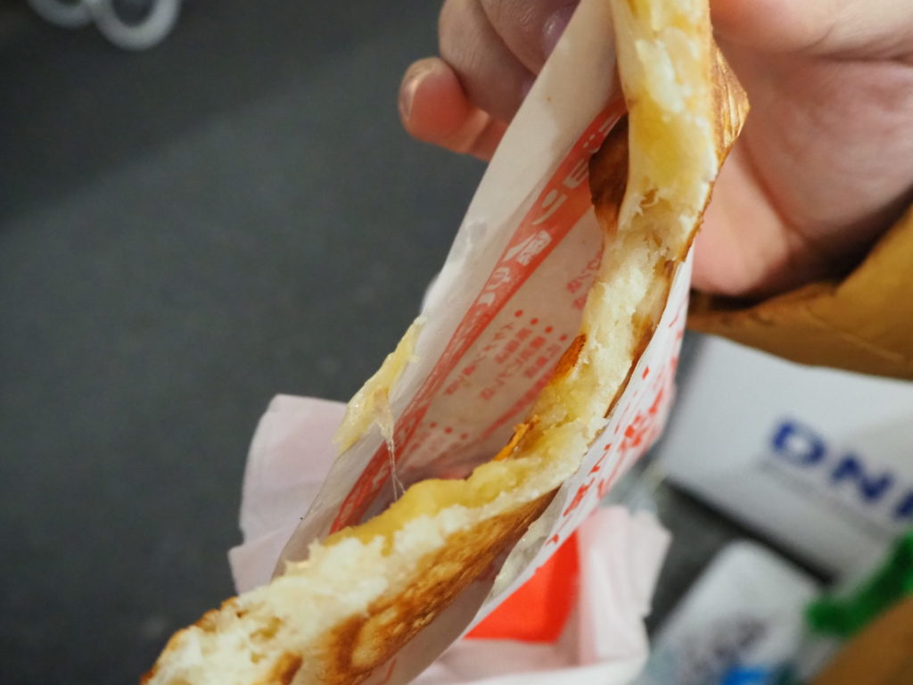 あんこを挟むのが主流ですが、チーズを挟んだり、プルコギを挟んだりとバリエーションが出ていて、今回私たちはさつまいもモッツァレラチーズ(350円)をいただきました。