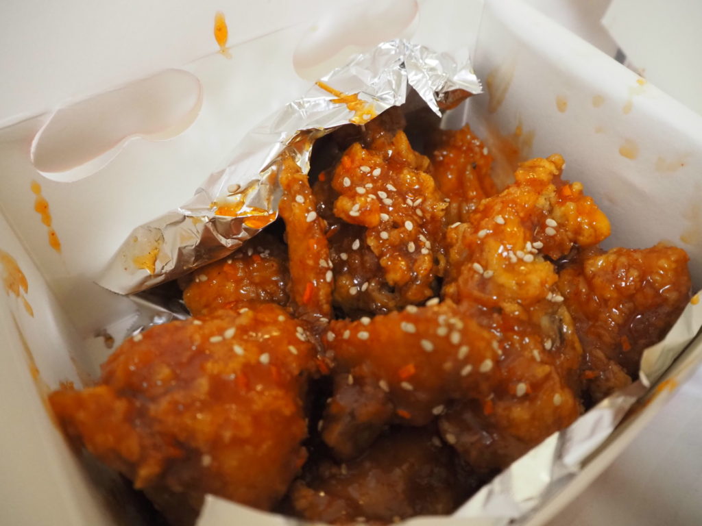 スイートチリソースのような、酸味のある甘辛ソース(ヤンニョム)を絡めたチキン。甘みと酸味が強いので、パンチのある味が好きな私には物足りなかったけど、美味しかった!