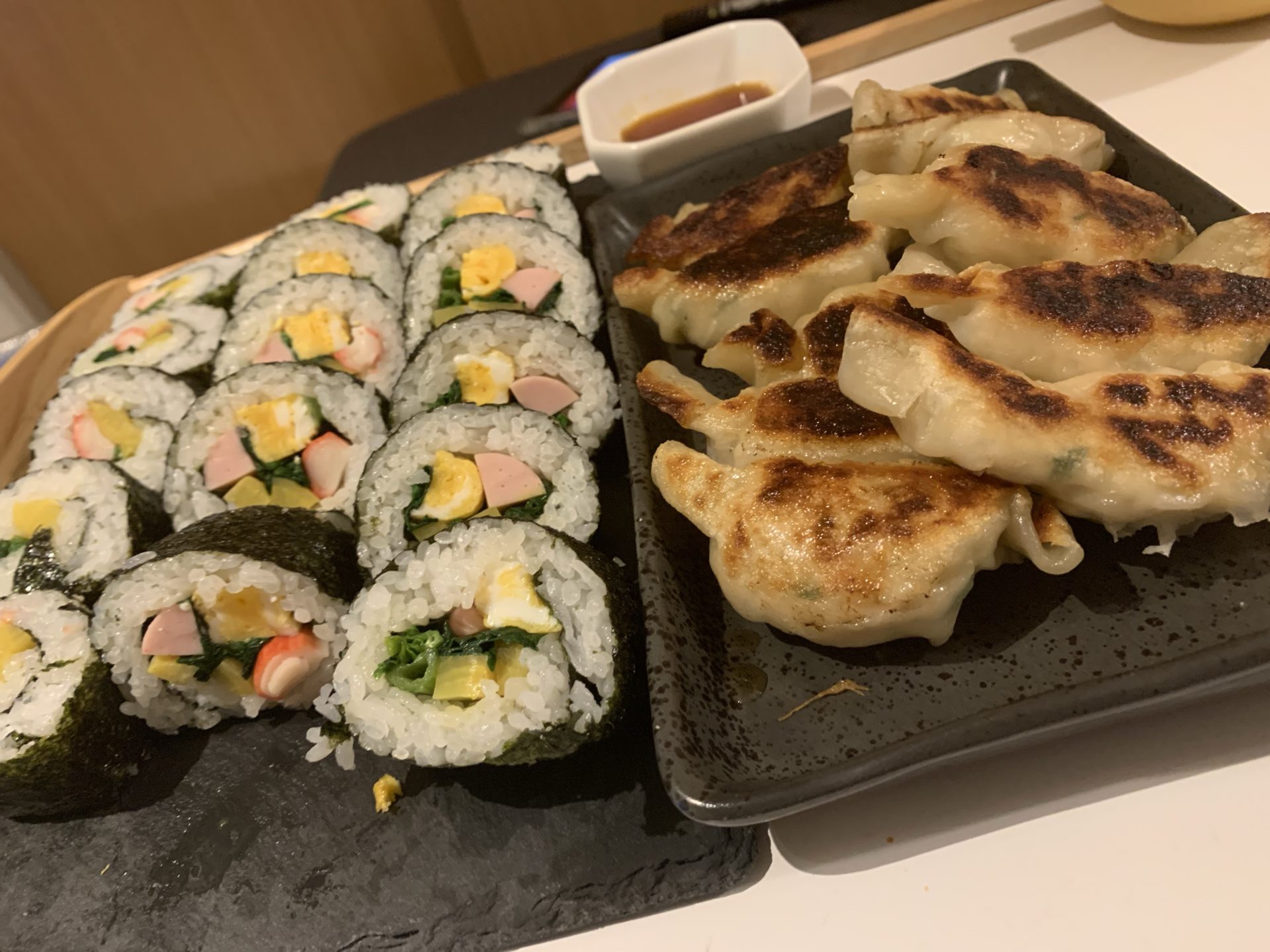本場の海苔巻きは、ごま油たっっっっっっぷり。きゅうり、にんじん、スパム、おでん、漬物、玉子が入っています。具材が細かく切ってあるので食べやすく、でもしっかり巻かれているのでこぼれない。