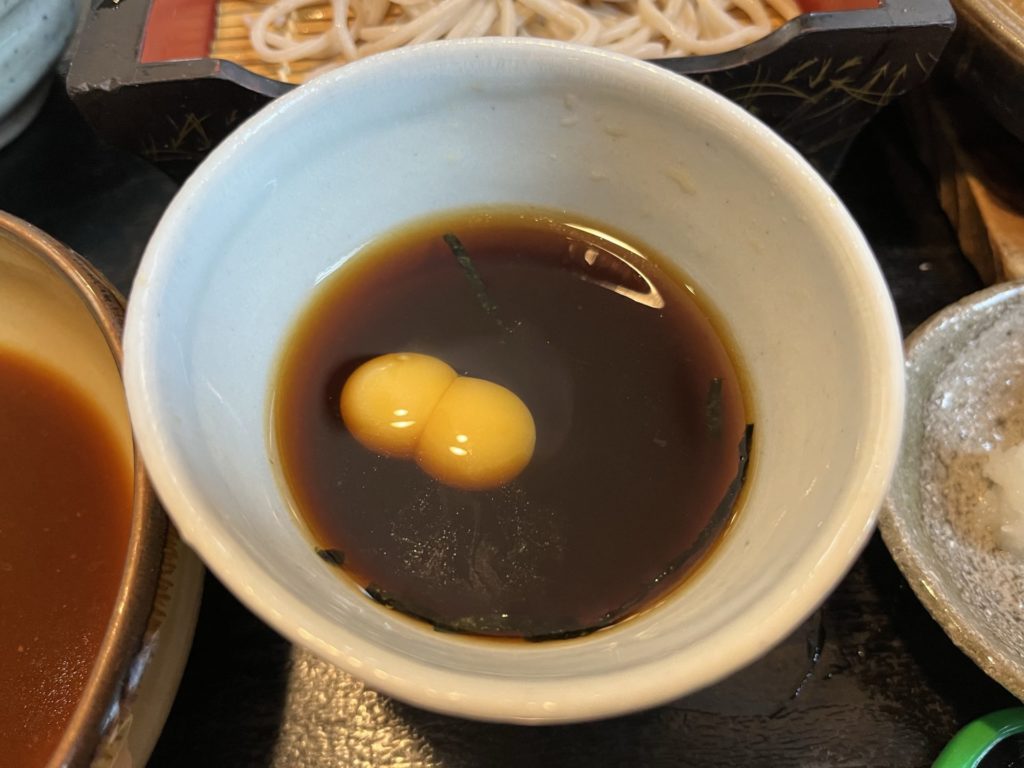 説明を聞いたにもかかわらずちげは、ざるそばを注文。この蕎麦もこしがあってツルツルでおいしい。ちげは今まで食べたそばで一番おいしいと言っていた。うずらの卵が双子だったので大喜び