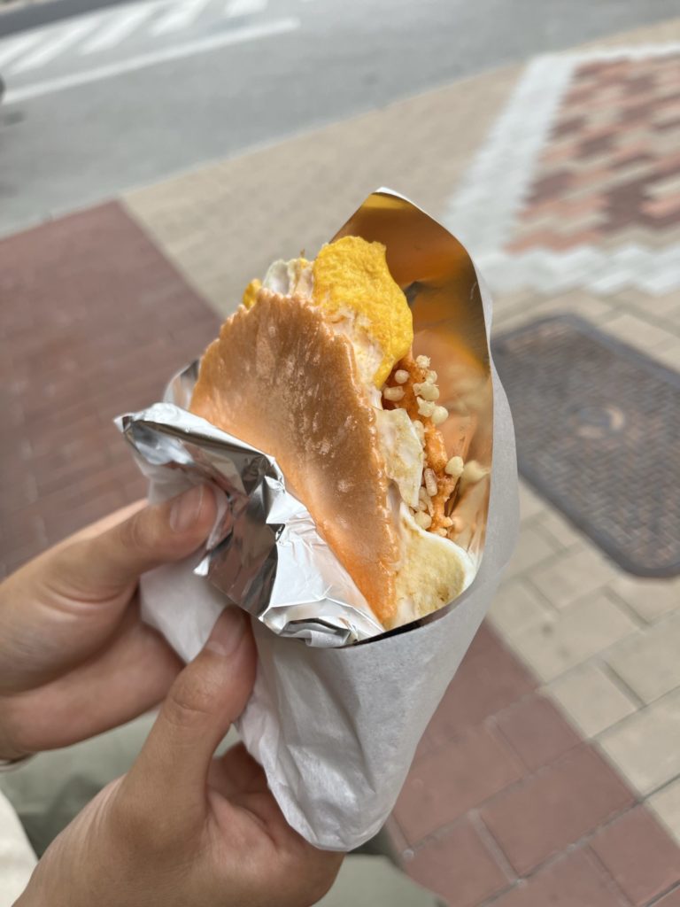 えびせんだかタコ前にたまごと揚げ玉が挟んであってソースとマヨネーズで味付けしてある。なんて事ない料理だがうまい。全てがうまい