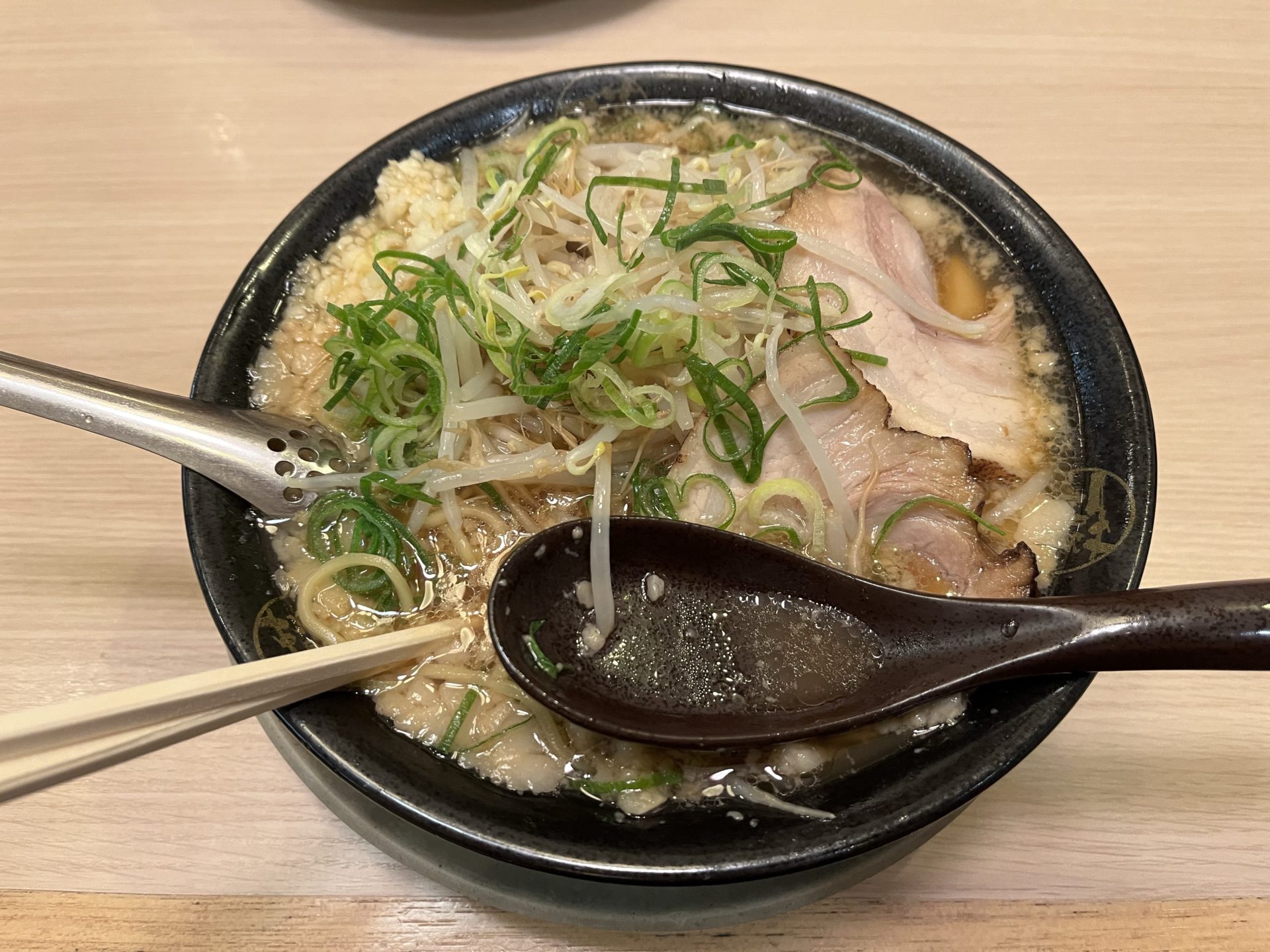 メニュー左一番上にドーンと載っていた豚ラーメン。見た目はジローだがスープはあっさりの醤油だがしっかりコクがある。麺は卵麺のいい香り。チャーシューはちげ好みだったらしく、絶賛していたを